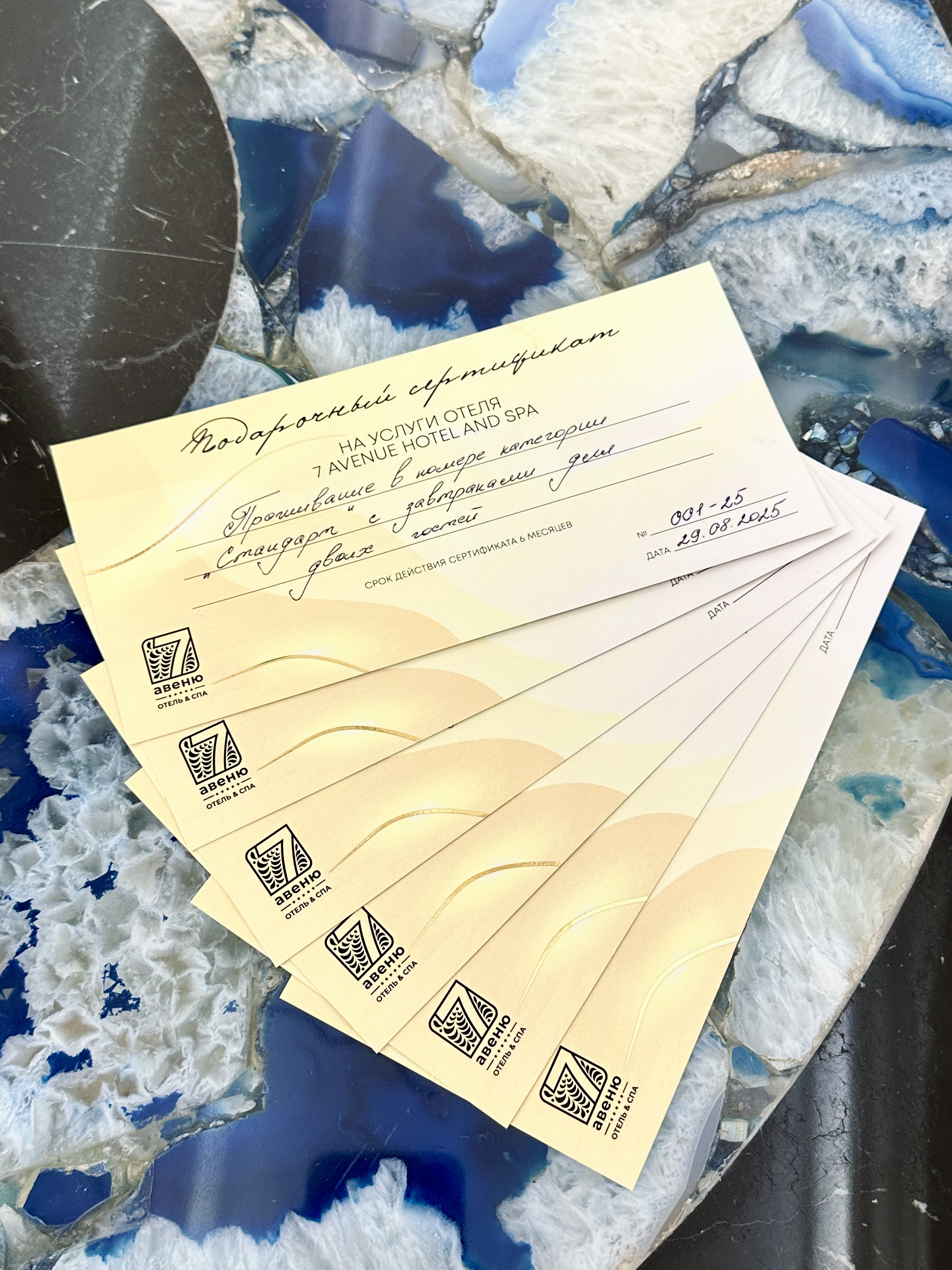 Чтобы воспользоваться сертификатом, необходимо предварительно связаться с администратором отеля, сообщив номер сертификата, и предоставить оригинал сертификата на ресепшен в день оказания услуги.
